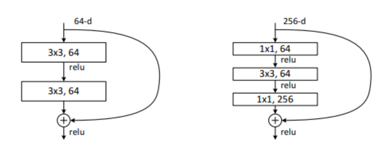 위 그림에서 왼쪽은 64, 오른쪽은 256 크기의 dimension이 input으로 들어온다. ResNet의 경우 bottleneck architecture를 이용하기 때문에 두 그림의 time complexity는 비슷하게 맞춰짐