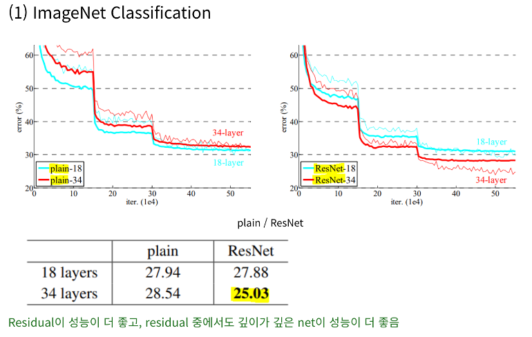 따라서 ResNet은 layer의 수가 많아지더라도 모델의 크기가 다른 모델들에 비해 비교적 작음!