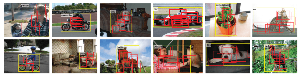 deformable RoI pooling을 사용했을 때, RoI에 해당하는 붉은 사각형의 모양이 object 형태에 따라 다양한 형태로 변형되는 것을 볼 수 있다.