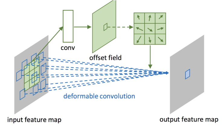 그림을 보면 input feature map에서 2 branch로 나뉘진다. 1 branch는 offset을 계산하는 conv layer이고, 또 다른 branch는 offset 정보를 받아 conv 연산을 수행해 output feature map을 생성한다.