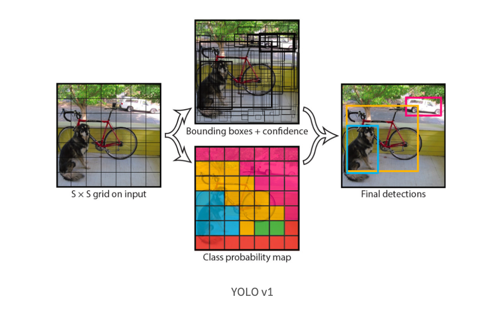 이를 위해 이미지를 지정한 grid로 나누고, 각 grid cell이 한번에 bounding box와 class 정보라는 2가지 정답을 도출하도록 만들었다.