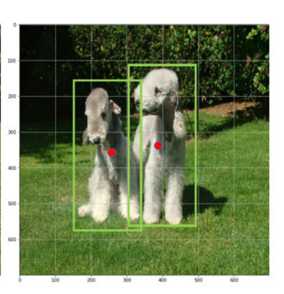 객체의 중심이 grid cell의 중심에 들어와 있으면 해당 grid는 그 객체 detect를 담당 (=오른쪽 사진에서 빨간 점이 객체의 중심, 이 빨간 점을 포함하는 grid는 객체 detect하도록 할당) (= 4행 3열의 grid cell이 왼쪽의 개를 예측하도록 할당되었고, 4행 4열의 grid cell이 오른쪽의 개를 예측하도록 할당
