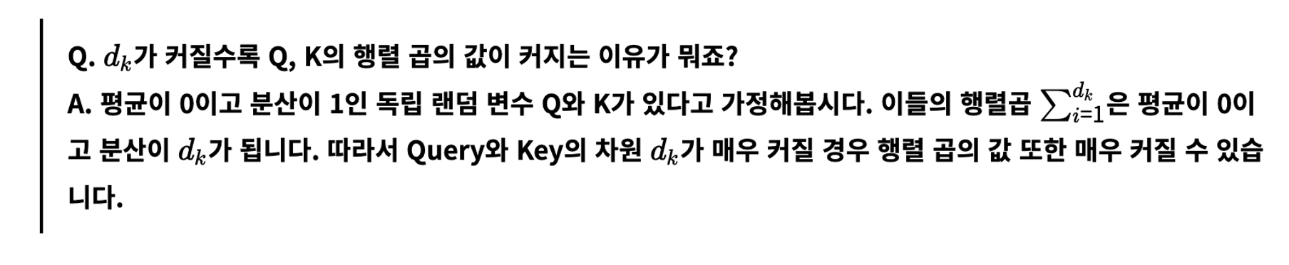 위 사진은 왜 dk가 커질수록 Q,K의 행렬 곱의 값이 커지는지에 대한 설명입니다. 저도 잘 이해하지 못해서 캡쳐본으로 남깁니다..