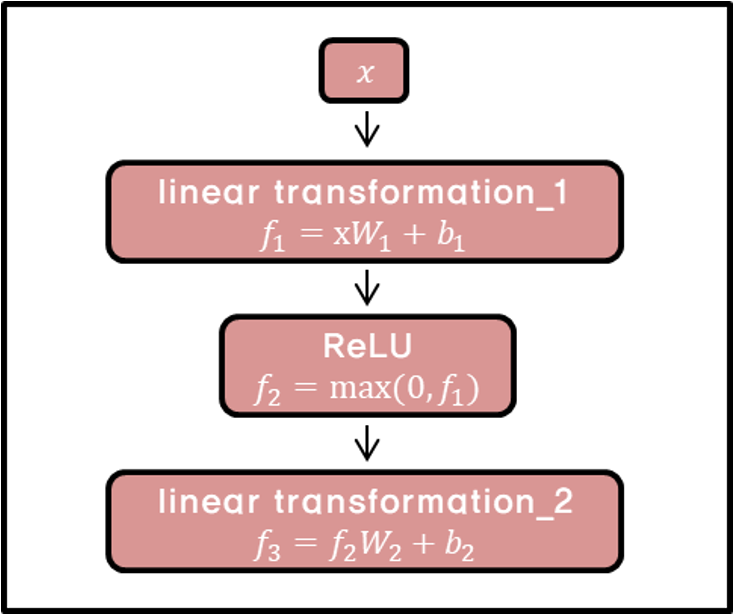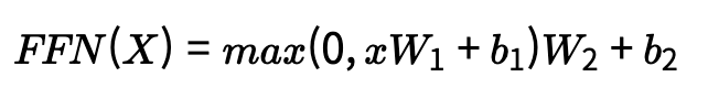 입력 벡터 x에 대해 선형 변환을 거친 뒤, ReLU 함수를 적용합니다. 그리고 한번 더 선형 변환을 적용하게 됩니다. 이때 레이어에서 각각의 position의 벡터들에 대해서 같은 파라미터 값(W1,b1,W2,b2)를 사용합니다.