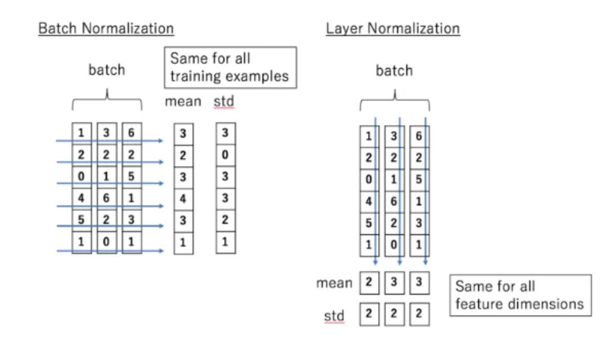 위 그림에서 Batch Norm은 feature가 6개이기 때문에 6개의 평균과 표준편차를 구하지만, Layer Norm은 batch안에 데이터 샘플의 수가 3개이므로 3개의 평균과 표준편차를 구합니다.