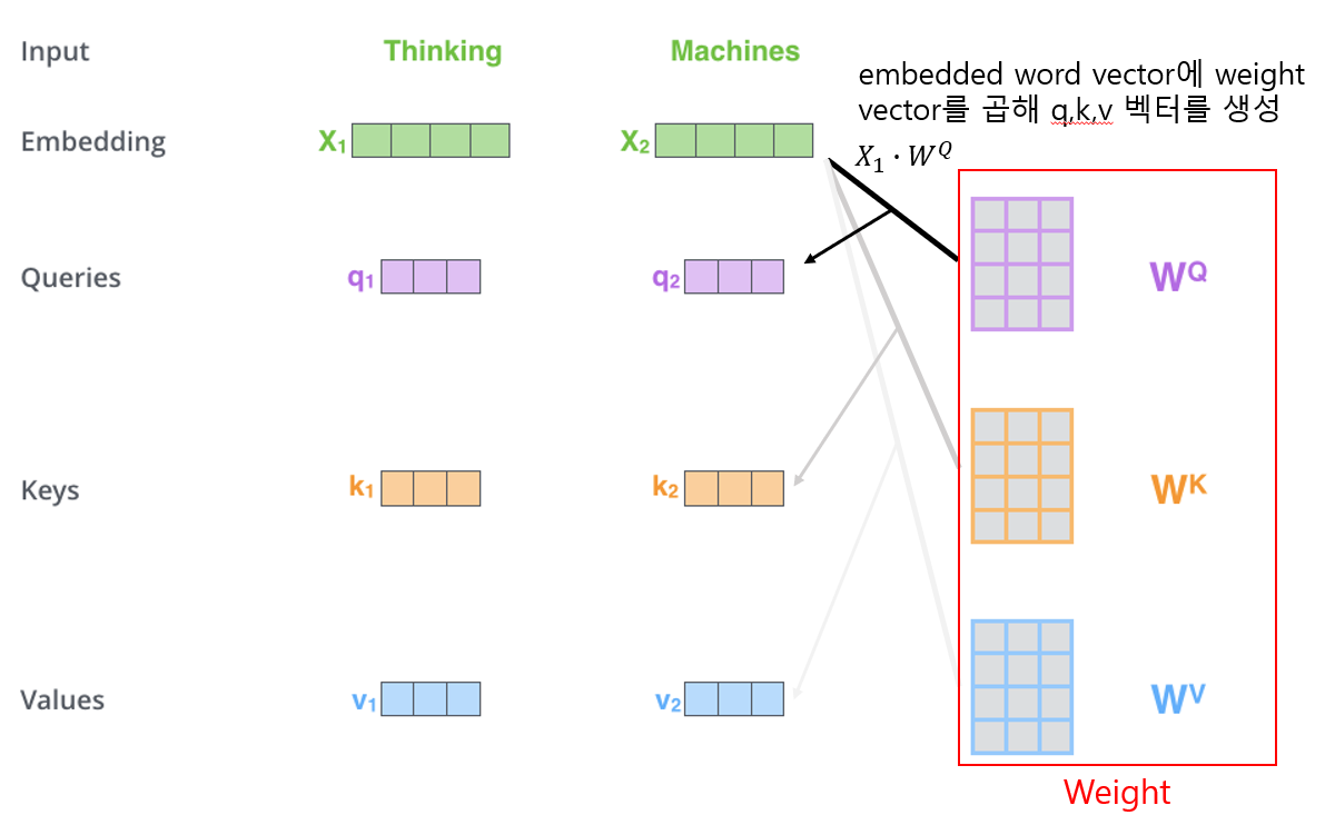 | Value : 다른 단어와의 Attention이 반영 최종 Representation를 얻기 위한 벡터 |
