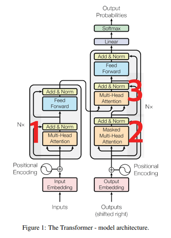 1. Encoder의 Multi-Head Attention에서 Key,Query,Value의 입력이 이전 인코더 레이어의 출력입니다.