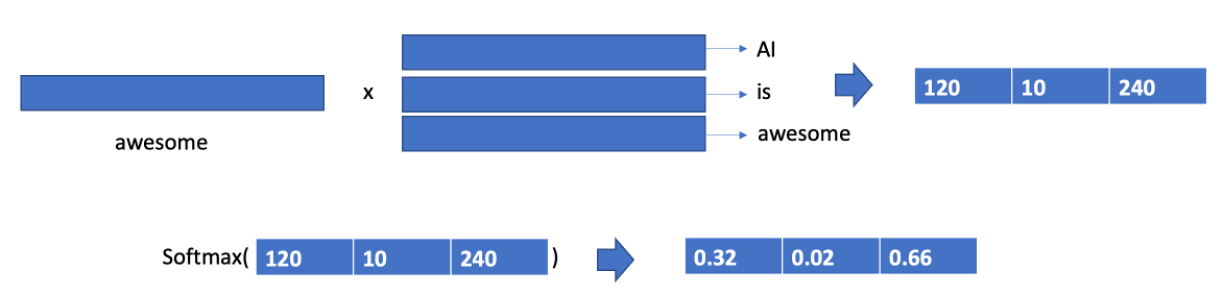 마지막으로 softmax를 통해서 Query 단어가 모든 단어들과 어느정도의 correlation이 있는지를 확률 분포 형태로 만들고, 이를 value matrix와 dot product를 해줌으로써 기존 vector에 Query와 Key간의 correlation 정보를 더한 vector를 만들어 줍니다.