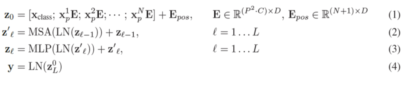 (3) : MLP head에 해당하는 수식입니다. 이전 입력 값에 Layer Normalization한 후에, Transformer에서 나온 값을 MLP합니다