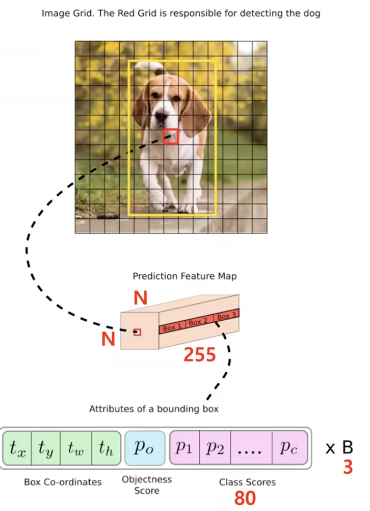 - 채널 수 = 3 x (4 + 1 + 80)입니다. 여기서 3은 한 scale에서 뽑는 bounding box의 수, 4는 x,y,w,h이고, 1은 objectness score, 80은 COCO dataset의 클래수 개수
