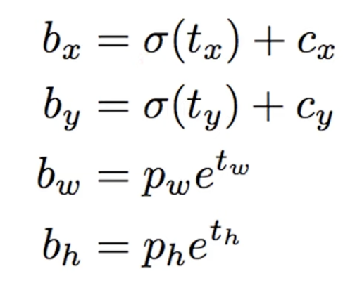 또한 박스의 width와 height는 원래 예측값 (Pw)과 박스가 움직여야하는 값(tw, th)의 지수 함수의 제곱을 통해 계산합니다