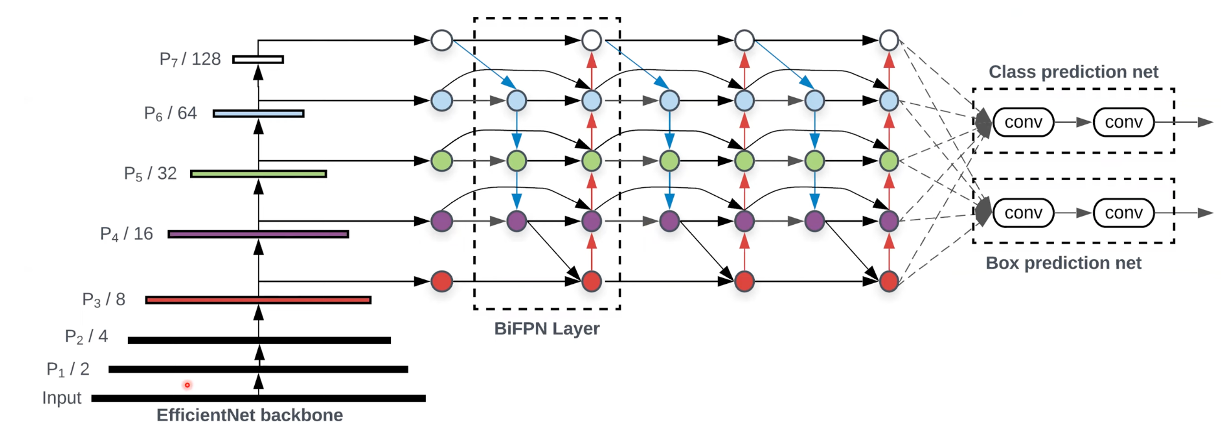 - weights are shared (=> BiFPN에서 Class/box pred layer로 넘어갈 때 보이는 점선들은 실제 어떤 layer가 존재하는 것이 아니라, 가중치들이 전부 공유되기 때문에 다음과 같이 표현한 것이다.)
