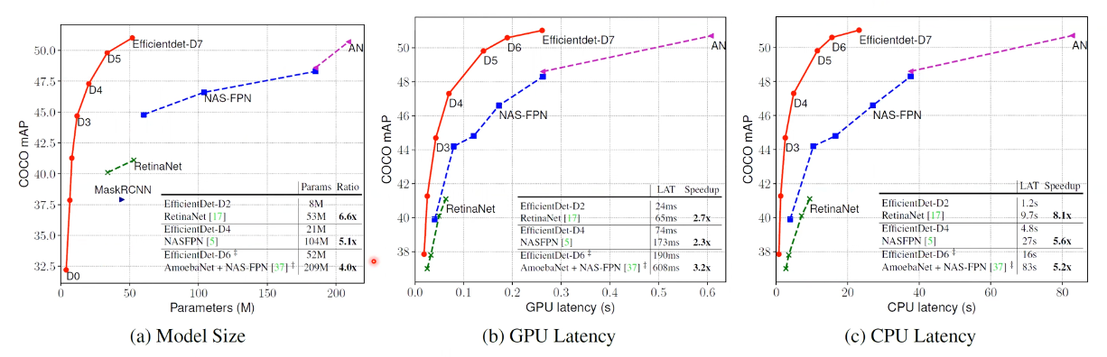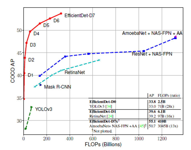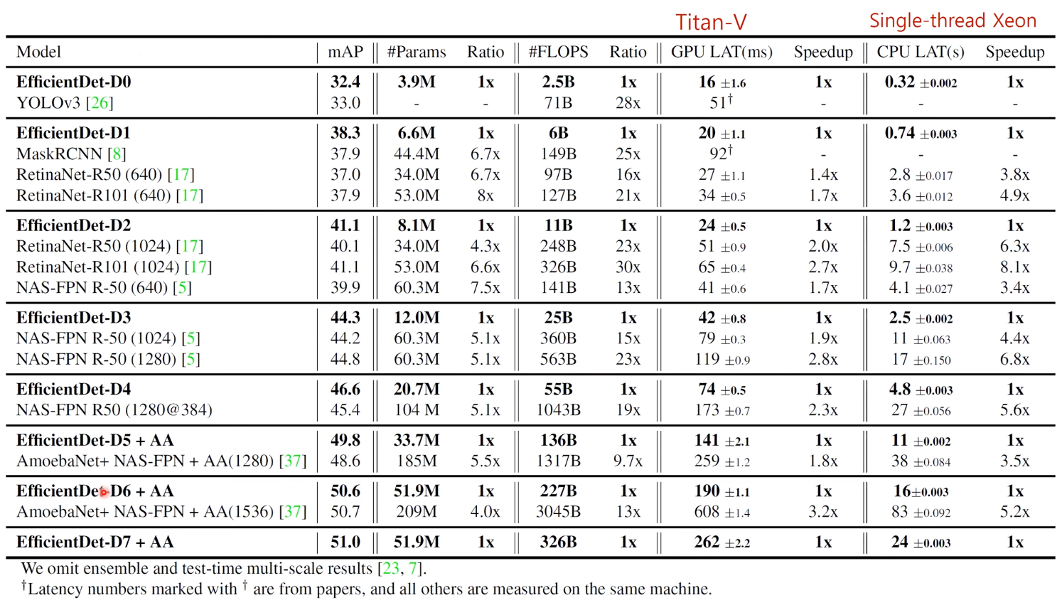 Ratio를 보면 1x가 기준이고, 예를 들어 yolo v3의 FLOPS는 28x인데 이는 EfficientDet-D0의 연산량이 1/28 이라는 의미이다.