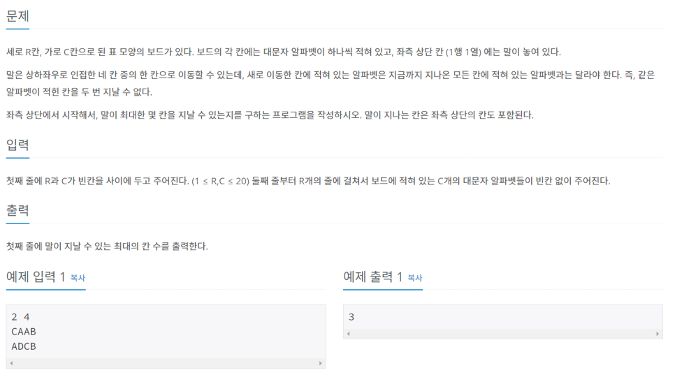 세로 R칸, 가로 C칸으로 된 표 모양의 보드가 있다. 보드의 각 칸에는 대문자 알파벳이 하나씩 적혀 있고, 좌측 상단 칸 (1행 1열) 에는 말이 놓여 있다. 말은 상하좌우로 인접한 네 칸 중의 한 칸으